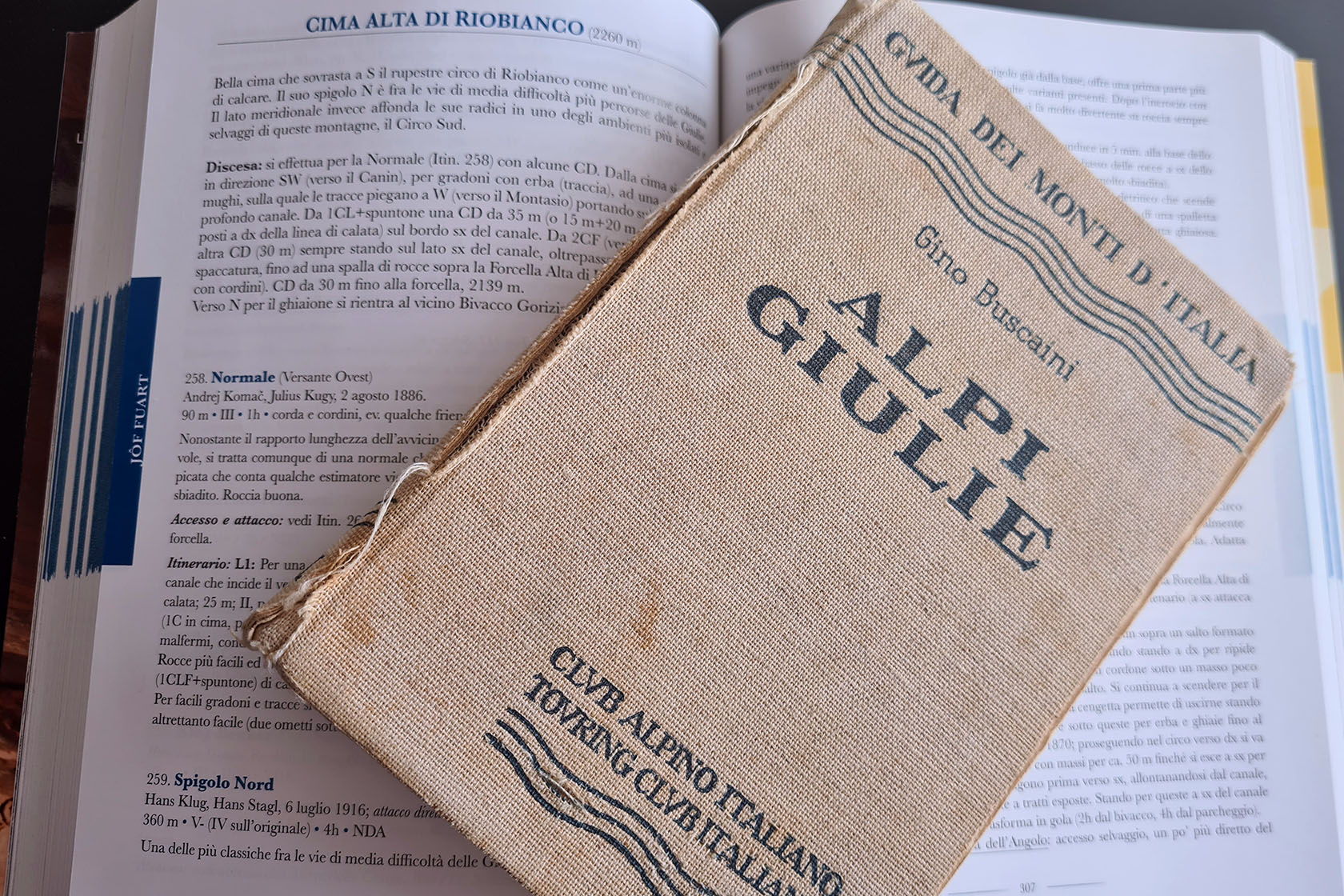 Dalla cima si scende verso ovest con una o più corde doppie fino alla Forca Alta di Riobianco. Da lì, invece di rientrare al Bivacco CAI Gorizia, seguiremo il panoramico Sentiero del Centenario, attrezzato con cavi e gradini e che termina con l’attraversamento di una articolata galleria di guerra.