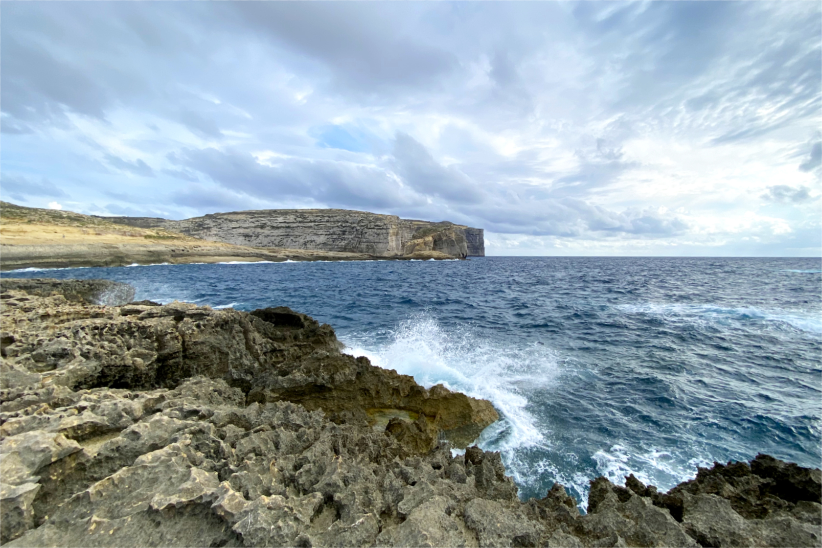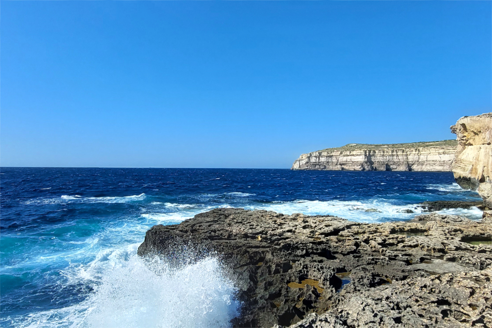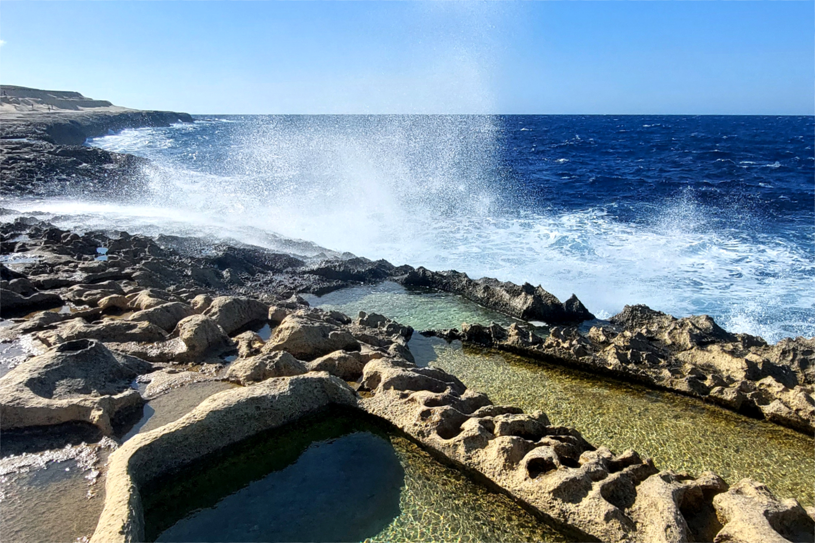 Il mare qui è meno verticale rispetto a Xlendi o Dwejra, ma estremamente vario: piscine naturali, saline, rientranze, archi bassi e rumore di onde che si frangono con continuità.