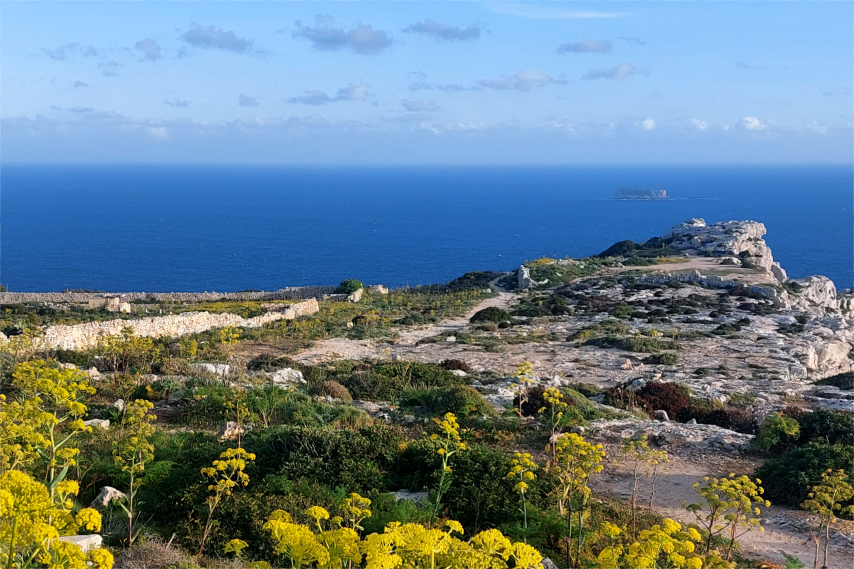 Dal fiordo di Xlendi si sale decisamente e, dopo qualche divertente e facile passaggio su roccia a gradoni, si ritorna al pianoro sommitale. Il paesaggio diventa sempre più lunare e aperto.