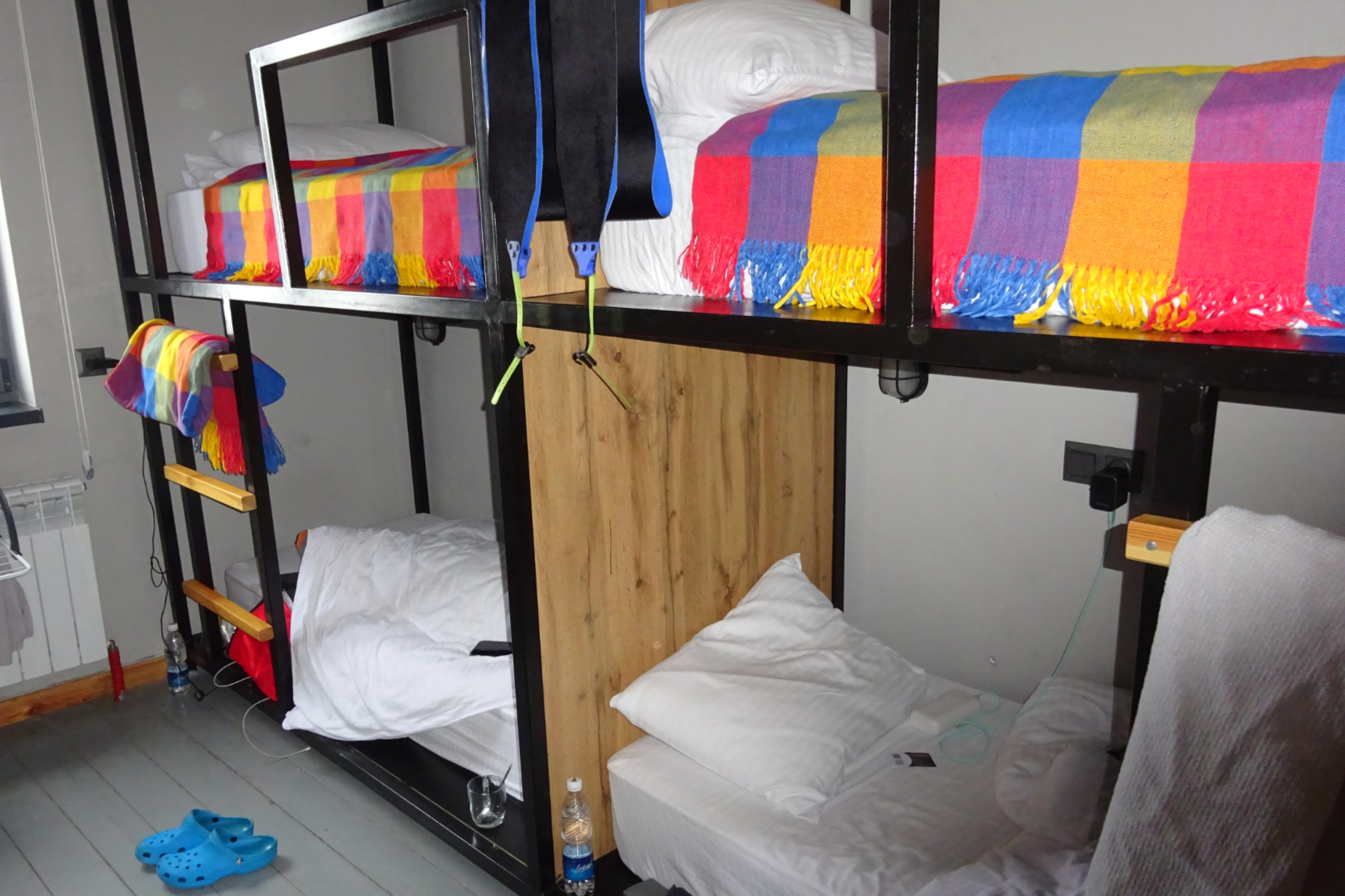 Le camere sono condivise ma spaziose mentre la sala da pranzo offre una vista sui monti eccezionale grazie alle sue bellissime vetrate.