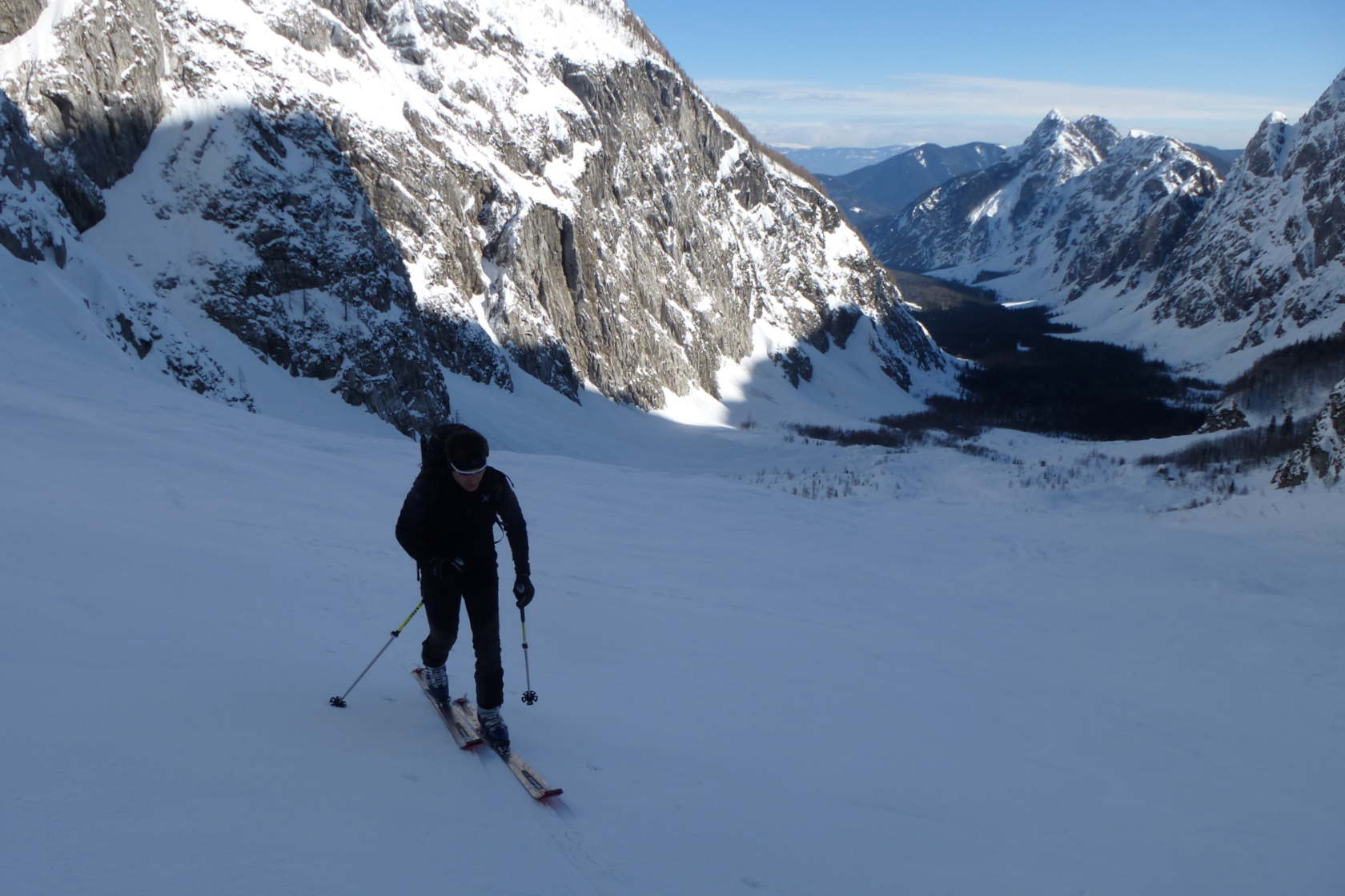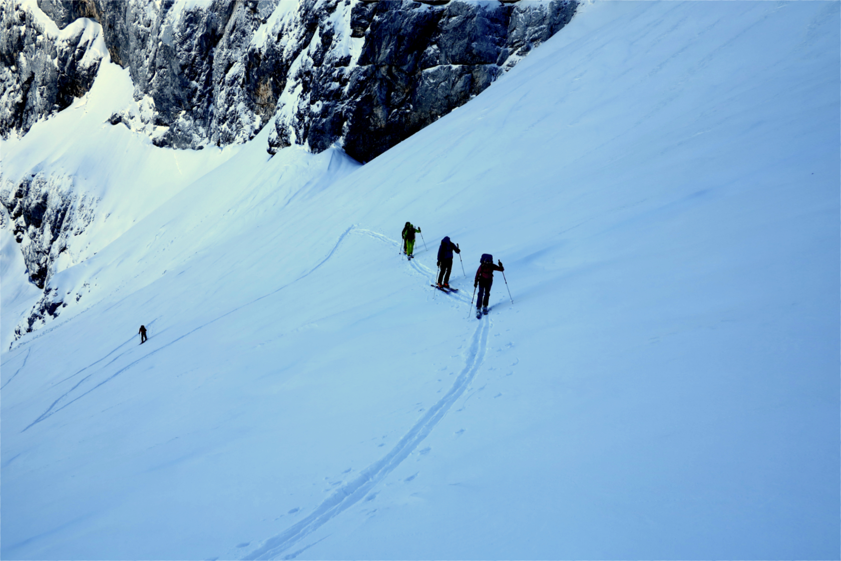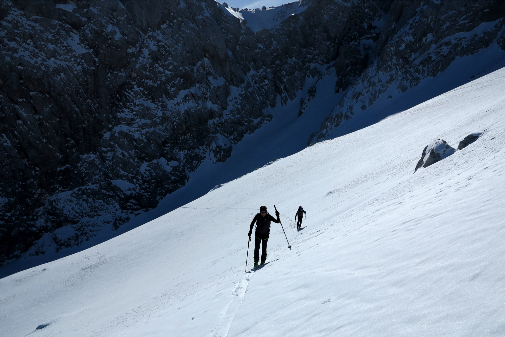 Per itinerario logico raggiungeremo la base del Canale Kugy, evidente couloir visibile anche da fondo valle. Non sarà questa la meta per oggi: piegheremo a destra superando un tratto più ripido per guadagnare il plateau terminale.