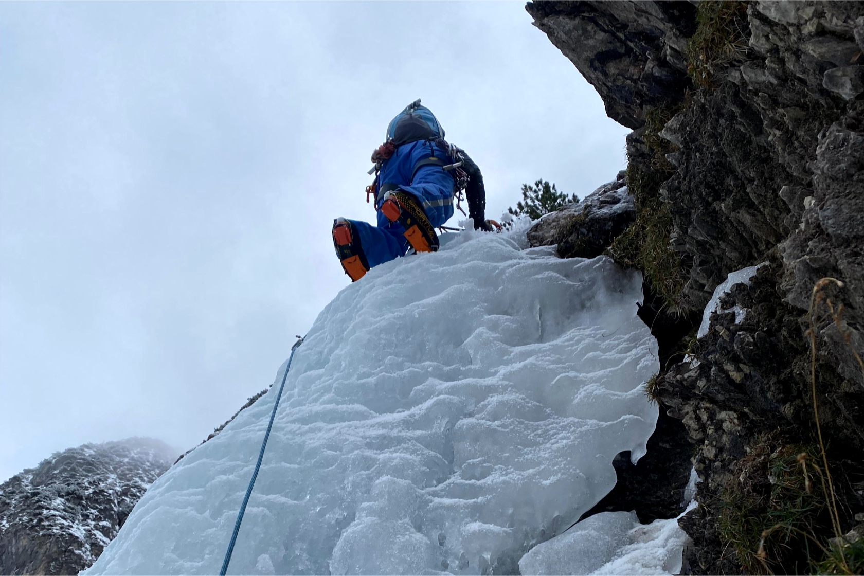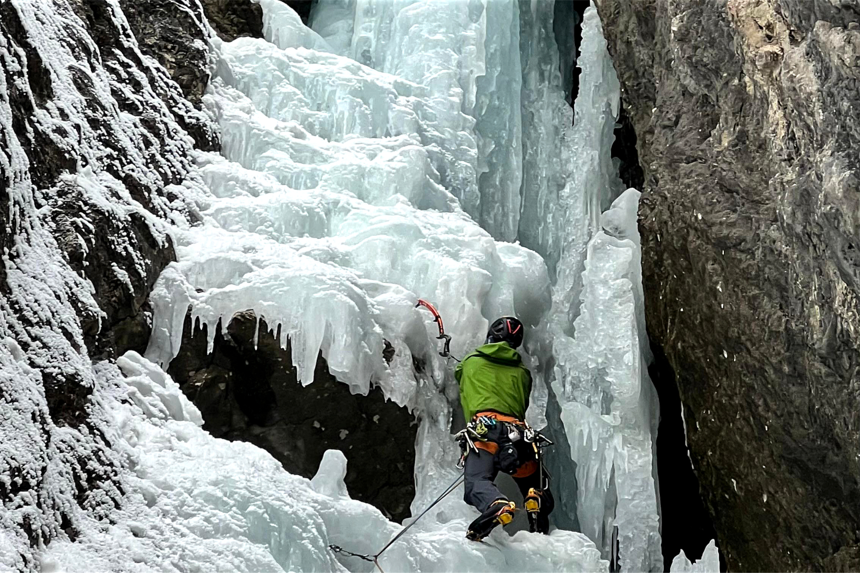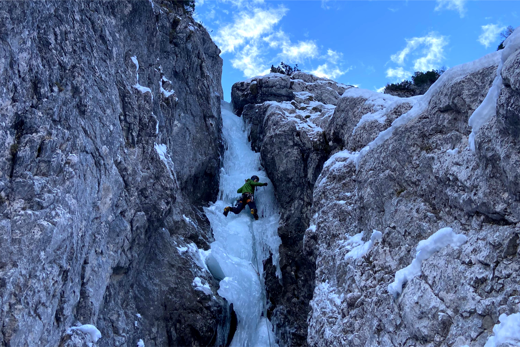 La nostra scelta ricade sulla bellissima Stella e Lucciole, una cascata che si incunea in una goulotte a metà parete che sa regalare bellissimi tiri per una lunghezza di 220 metri.